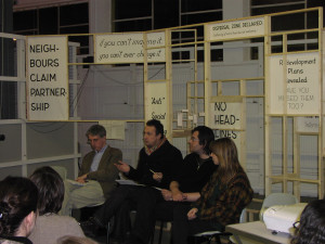A discussion moderated by Can Altay, with architect Neil Bennett (Terry Farrell and Partners), David Cunningham (University of Westminster), Janna Graham (Serpentine Gallery), Chloe McCarthy (My City Too), Jonathan Mosley (architect) and a representative of the Migrants Resource Centre.