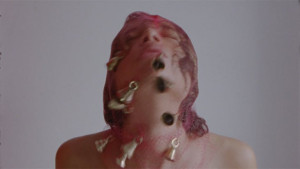 Phoebe Collings-James mends this sentiment to her film Mother Tongue, Mother Master (2018). Filmed from her shoulders up, the artist wears identical little bells tied to the red plastic of a bag to hold some sort of citrus. The bag lightly pushes her face inward, her neck balancing, she shakes her head and it becomes clear that there is a parallax between the soundtrack and her movements, yet somehow they feel completely connected. As she moves her head back and forth, forward and backward, moving the bells swinging in unsealed unison, it becomes hard to tell if she is drowning out the soundtrack or if it is drowning out her. She continues to let the bells move freely, opening and closing her mouth, feeling the weight of the bells and then suddenly, as the soundtrack wanes so too does Collings-James, until she takes off the instrument.