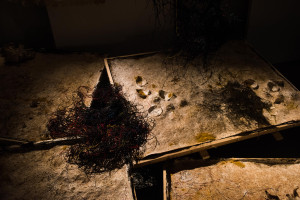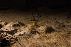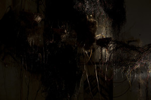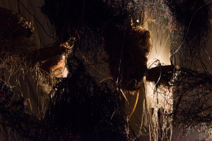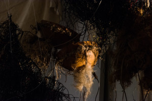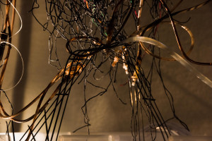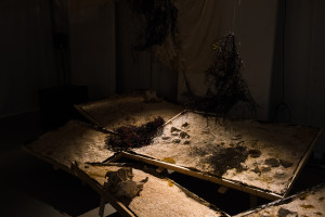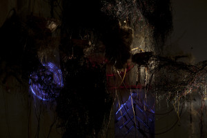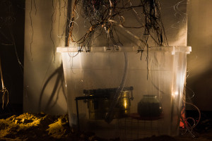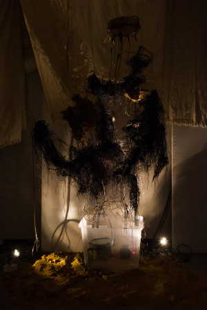 This immersive, sonic environment was set in an electronic organic installation including fungal mycelium-scapes embedded with texts, plant fibres, electric wires and coconut shells. Structures of hardened cotton and plant fibre were suspended and interwoven with polyrhythmic sound sculptures, whilst the resulting sounds were transcribed visually by custom-made, touch-triggered and midi-controlled sound-light interfaces, developed by Eyongakpa with a constellation of collaborators.
