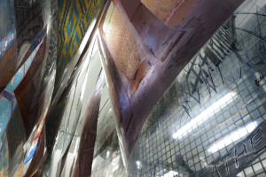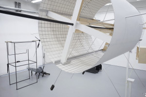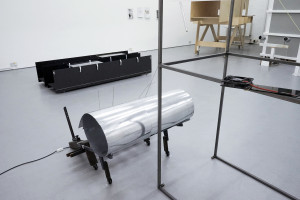 The installation at The Showroom includes existing sculptural pieces from earlier iterations of Dawn Breaks combined with newly produced works that have been created onsite. These use materials such as wood, metal, mirrors, and an array of leftover objects found in the local area and repurposed for the project.