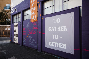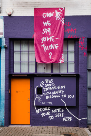Following The Showroom’s June 2021 reopening, we installed a new banner on our façade in place of Sinikiwe Buhlungu’s initial message: TO GATHER TO–GETHER. Selected from 46 seconds into Mixtape 1, amidst the existing audio recorded by people walking past The Showroom from October 2019 – March 2020, WHAT’S ACTUALLY IN MY MIND? (00:46) then greeted our community. The timestamp contextualised it as a reference and past reflection, whilst the familiar aesthetic and unique punctuation framed it as an invitation: a question. Its relatively short duration echoed that of a WhatsApp voice note, yet also indicated a short message that infinitely loops, just like the thinking of this question within one’s own – and communal – mind.