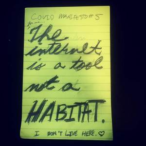 “I started a Covid Manifesto on Instagram to disrupt our dependency on social media and the ways in which it soothes us. Over the years I’ve made a lot work about the police and capitalism, but I want to be present for what’s happening right now. Our estranged relationship with this planet is the reason for Covid-19. Full stop. Our leaders are so obsessed with the maintenance of this exploitative economy that we can’t have a conversation about how to live. Art is for creating another space that isn’t about power, but rather about intimacy, fragility, and humanity.