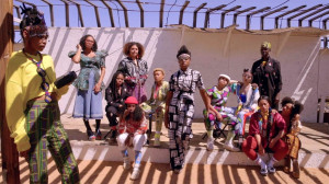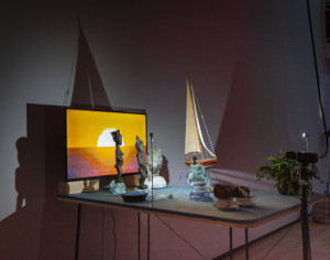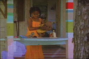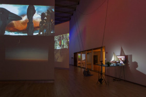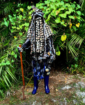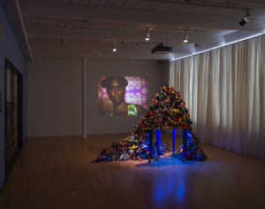 “In Cauleen Smith’s video Egungun: Ancestor Can’t Find Me (2017), a figure shrouded in shells wanders zombielike in a lush African landscape. In Yoruban societies, egungun are costumed dancers who appear at public celebrations. Smith’s is more monstrous—an animated corpse of a slave-ship captive gone overboard during the Middle Passage that has now emerged as a haunting. Transferred from 16-mm film, the video has a grainy texture that enhances the barnacled cloth of the costume.” – ArtNews